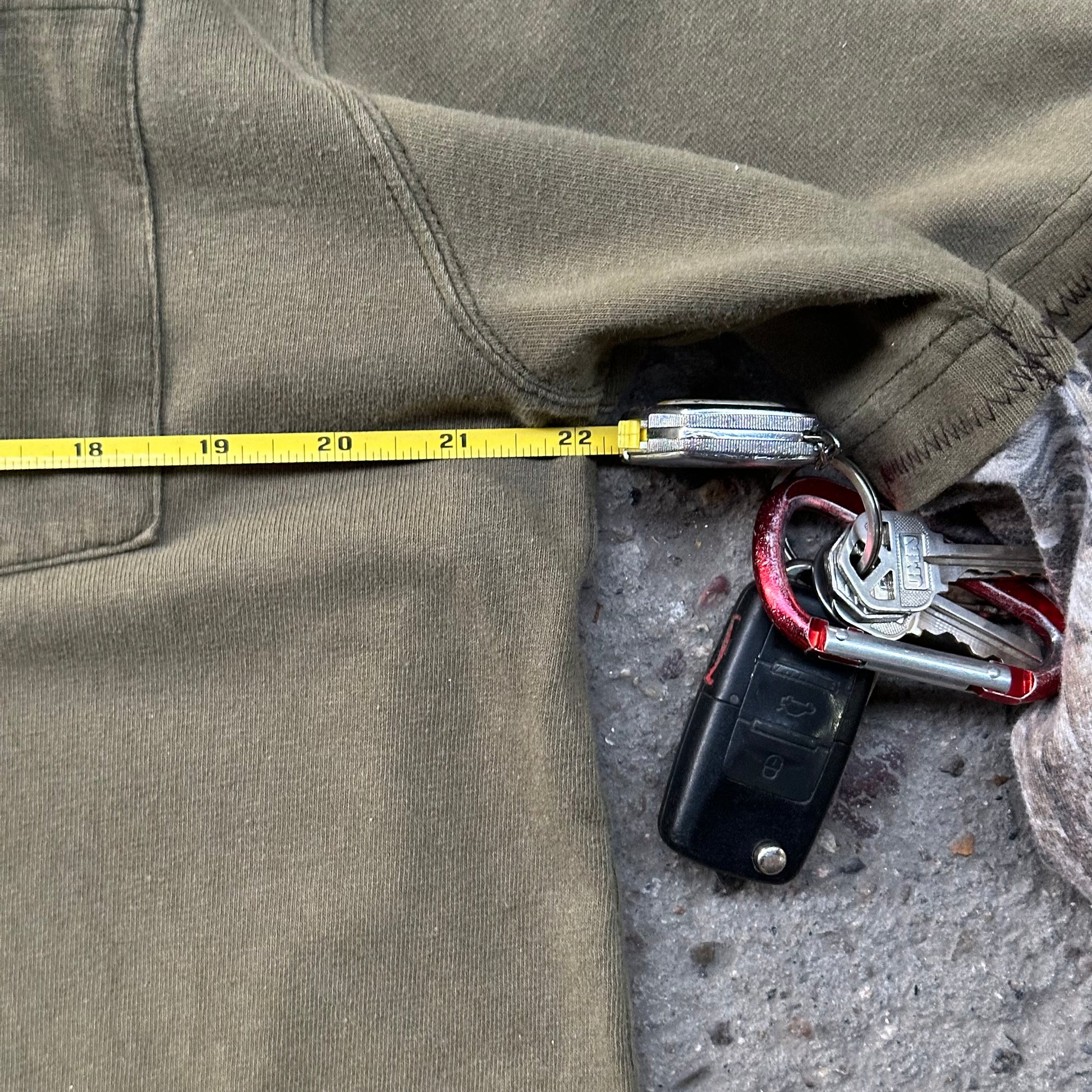 Vintage Carhartt base reworked with camo green sleeves, zigzag seam embroidery, and adjusted into a sharp boxy fit. Unique one-off custom piece.