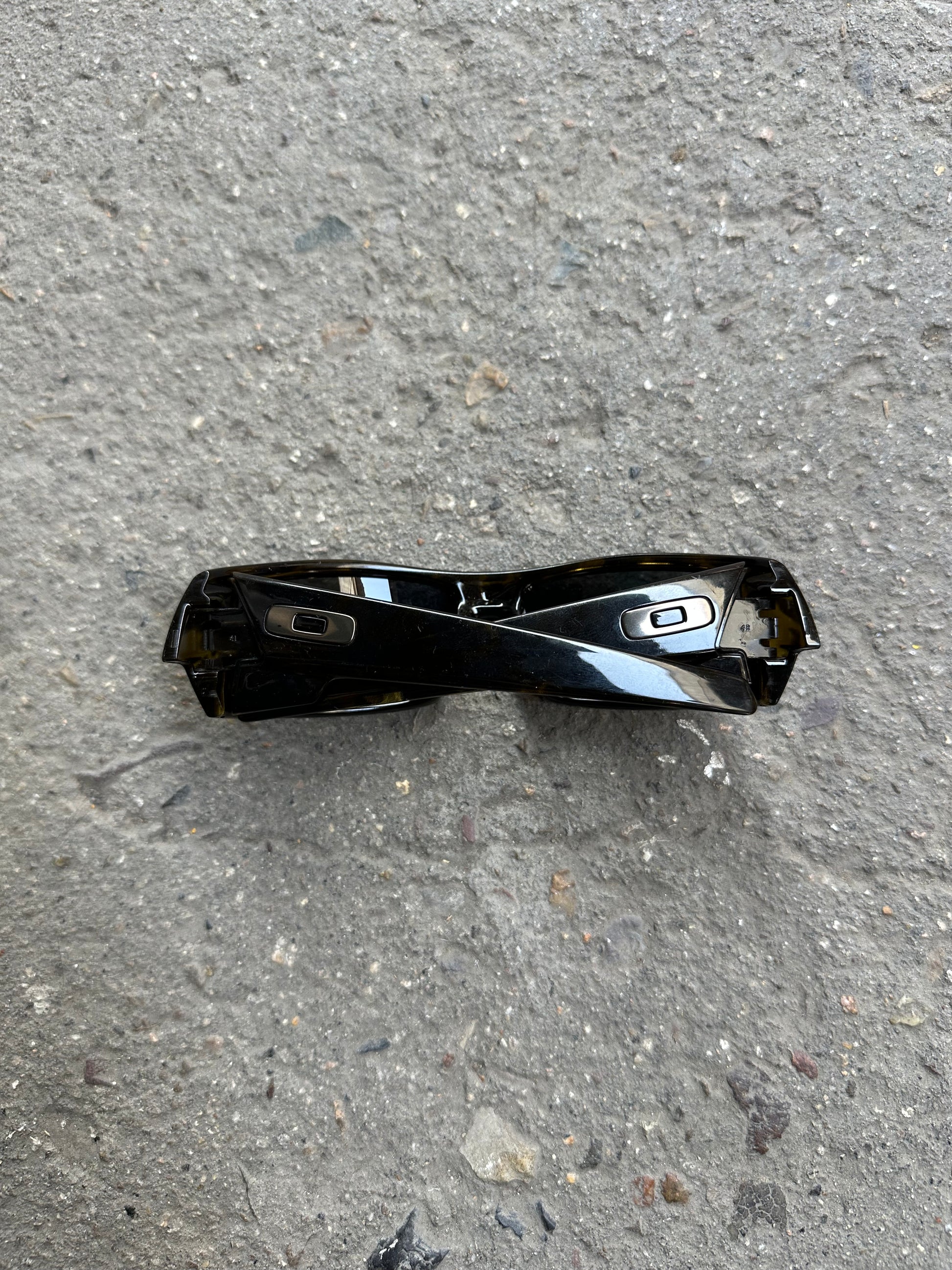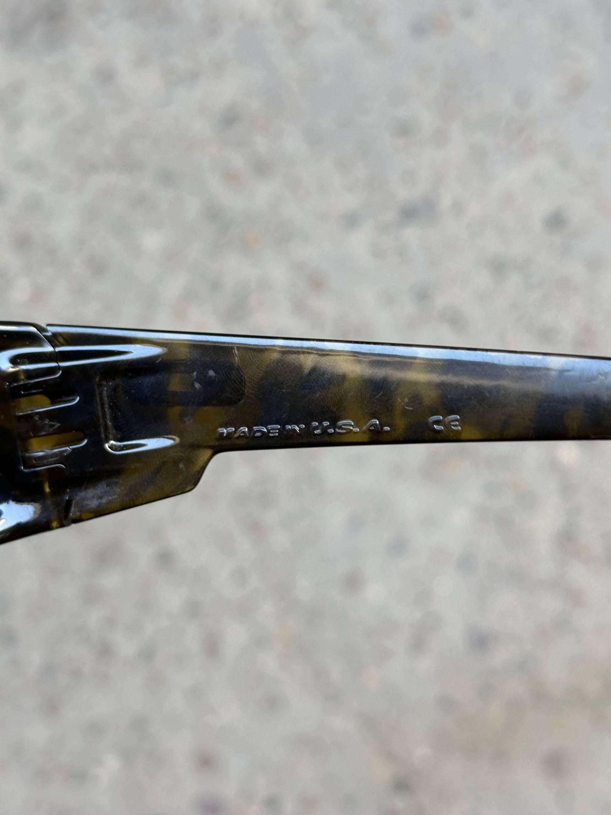 Bold wraparound silhouette with all-over camo pattern and polarized lenses. Clean condition, no flaws — strong Oakley statement piece.