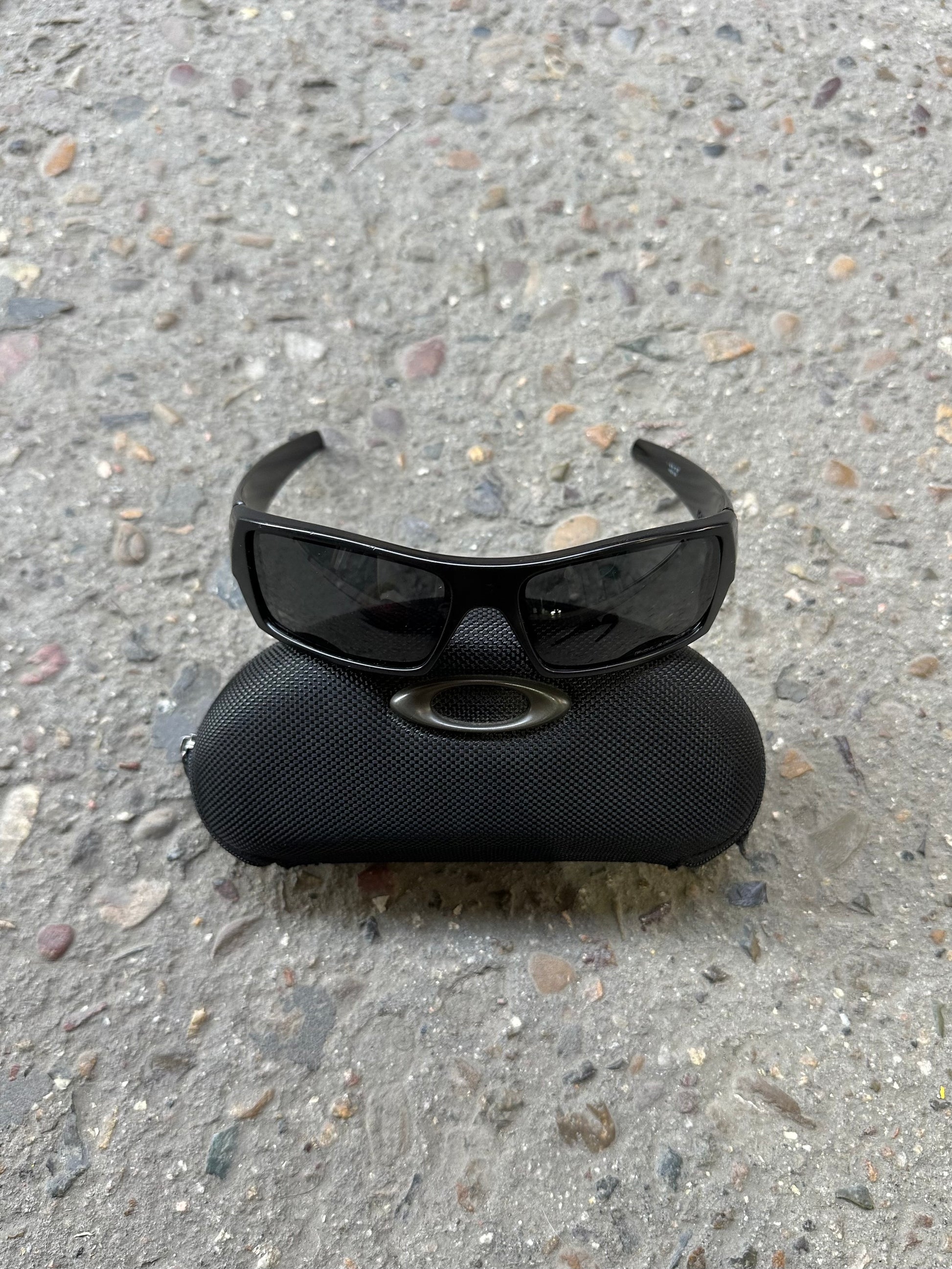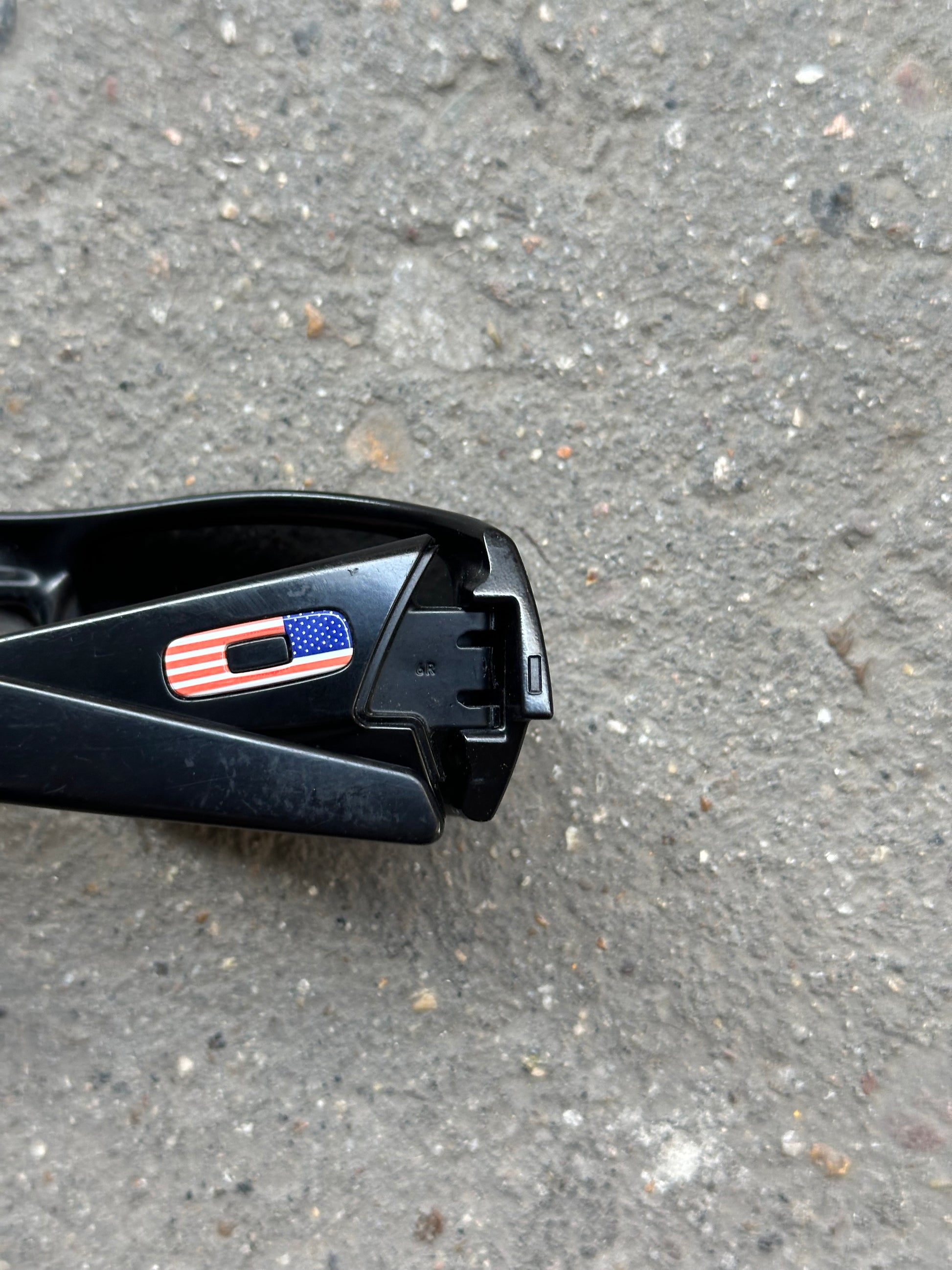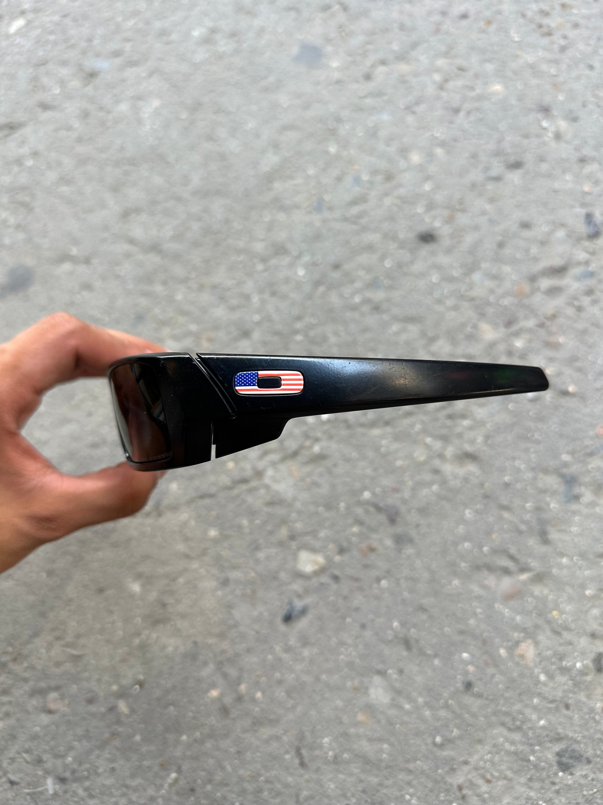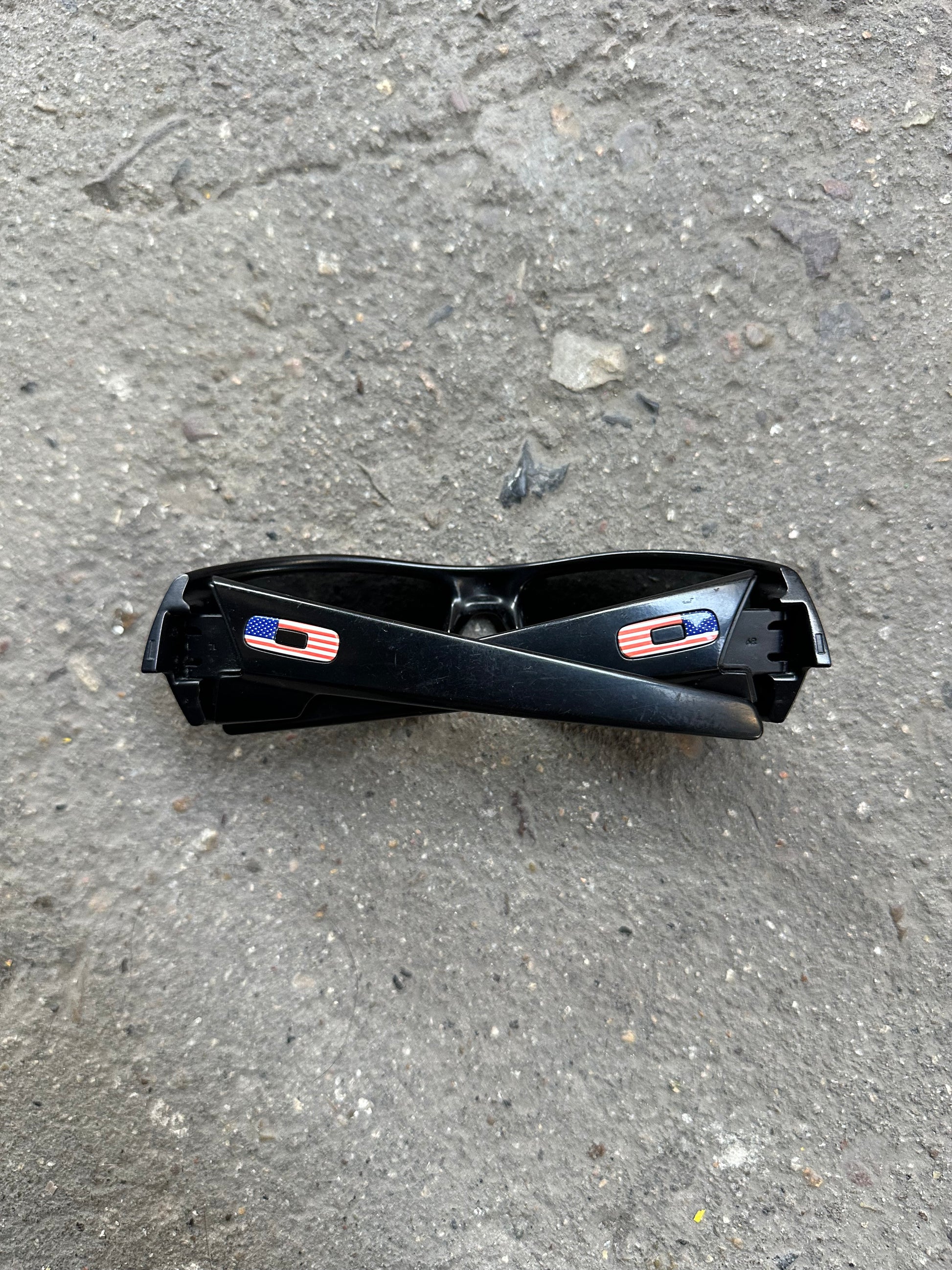 Matte black wraparound frame with USA flag icons on the arms. Polarized lenses show light signs of wear but remain fully functional. Includes Oakley hard case.
