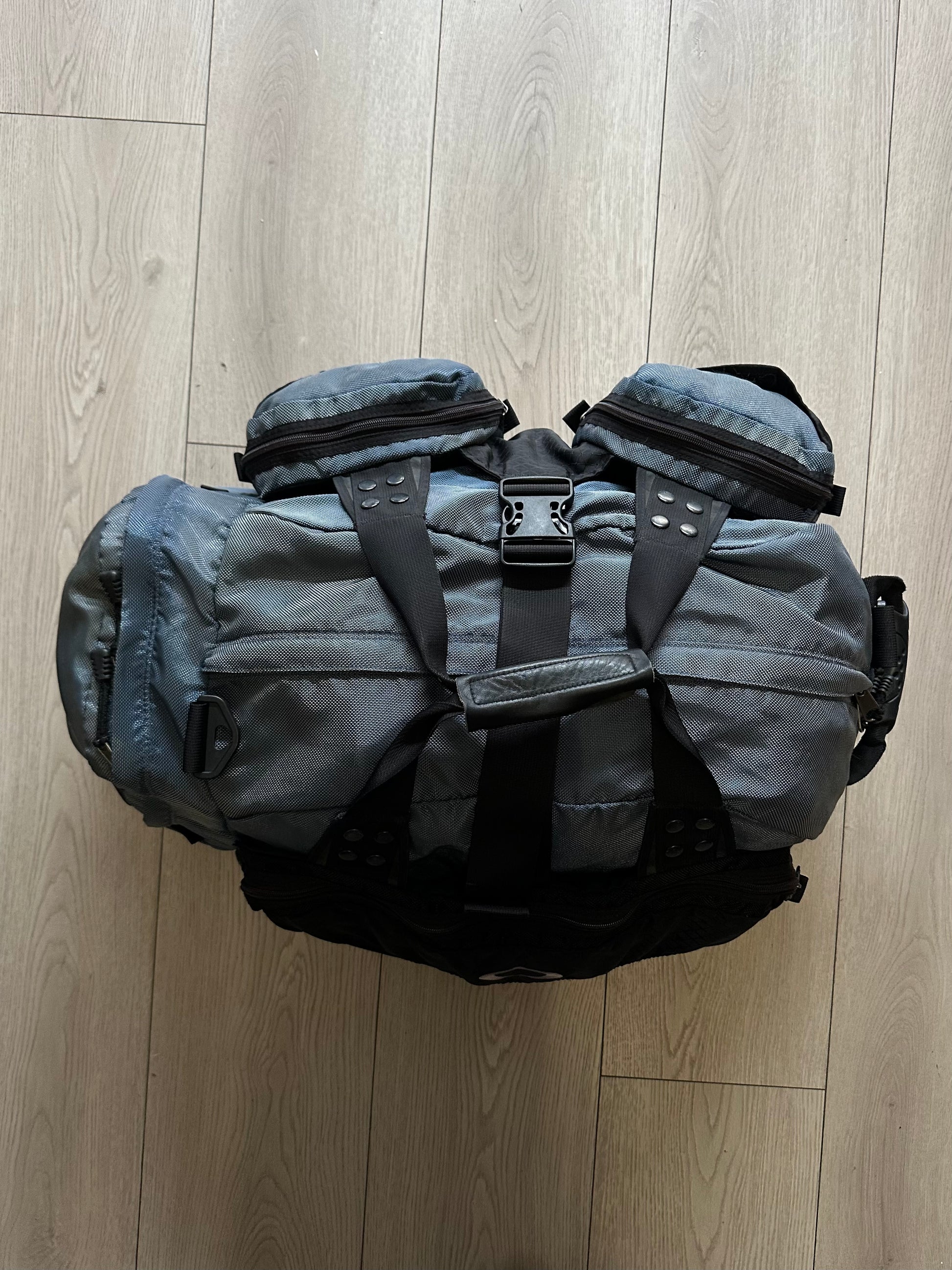 Massive Oakley gear bag with oversized 90s build and red tab detail. Extra-large capacity (23” x 32”), showing signs of use but built tough for travel or storage.