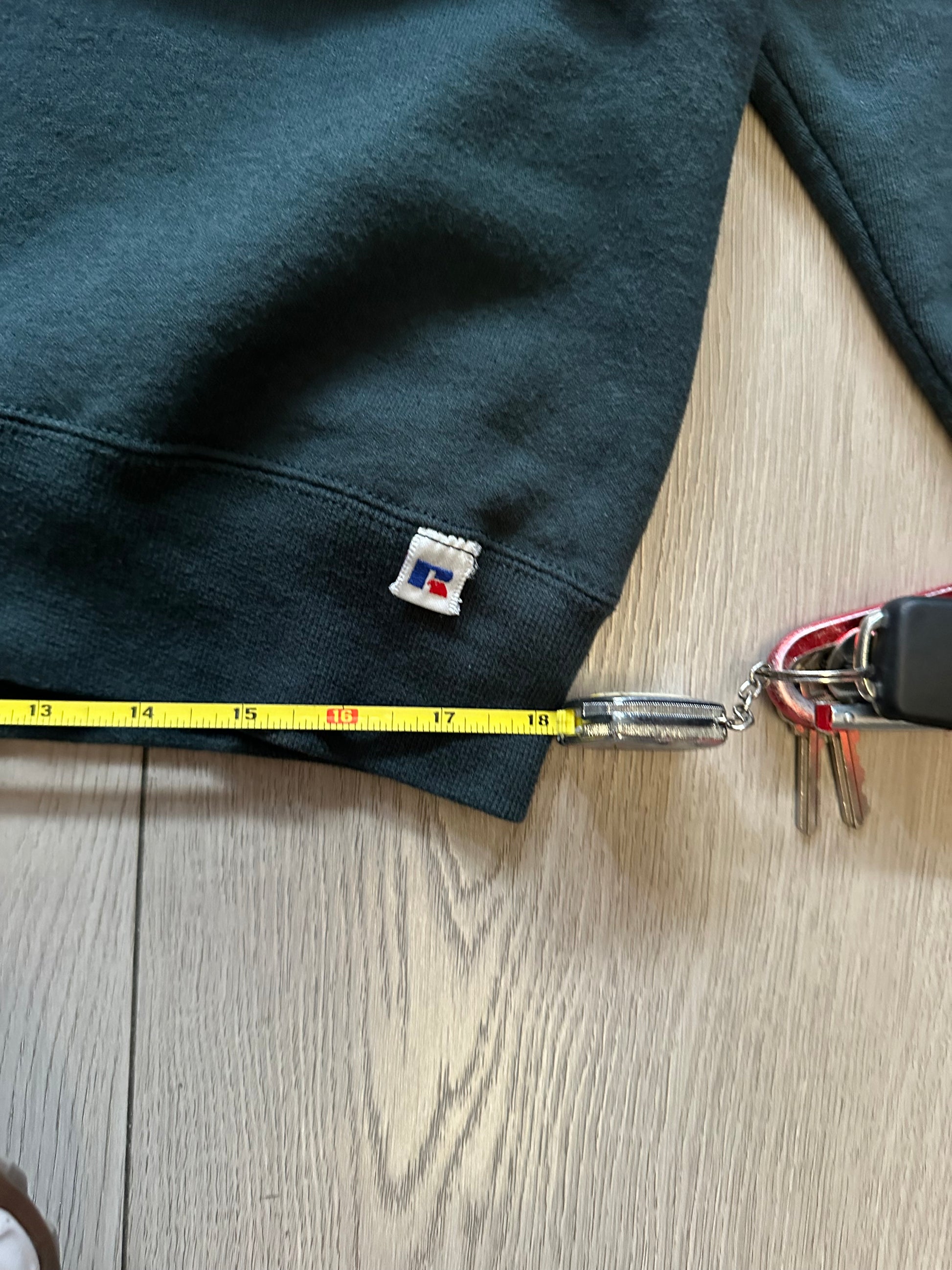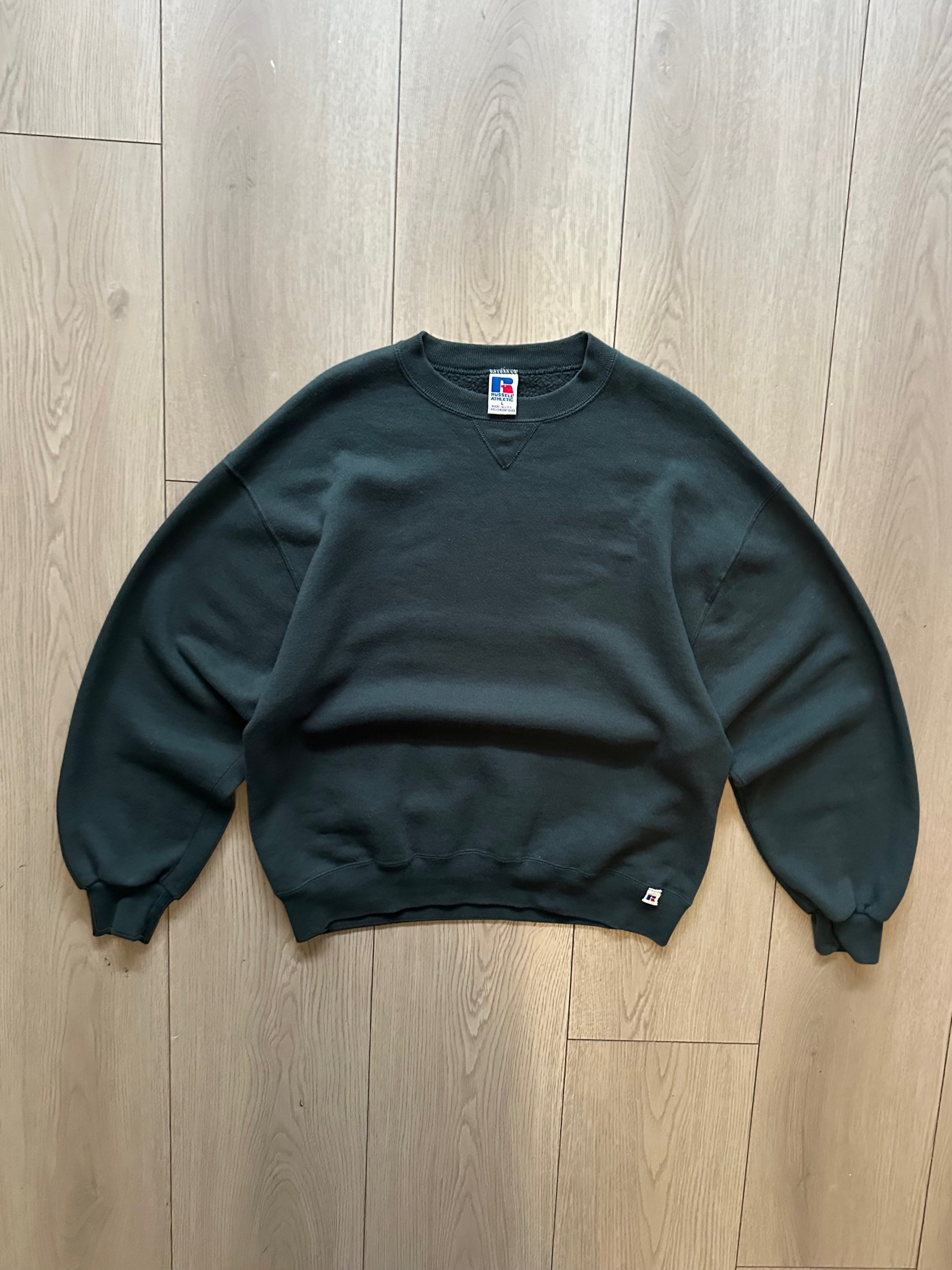 Dark forest green heavyweight cotton with a perfect boxy drape. Made in USA, flawless condition, classic 90s Russell quality.
