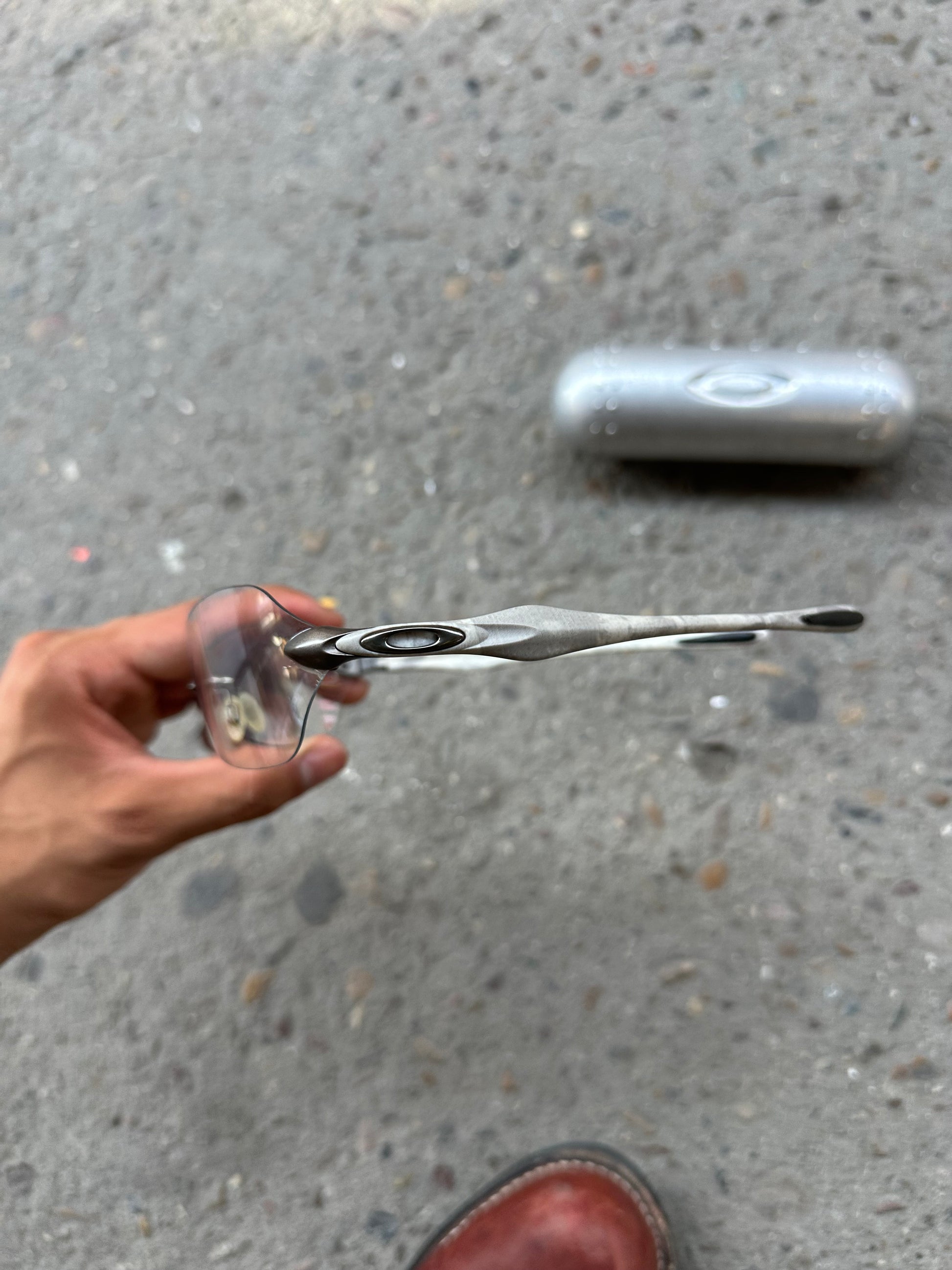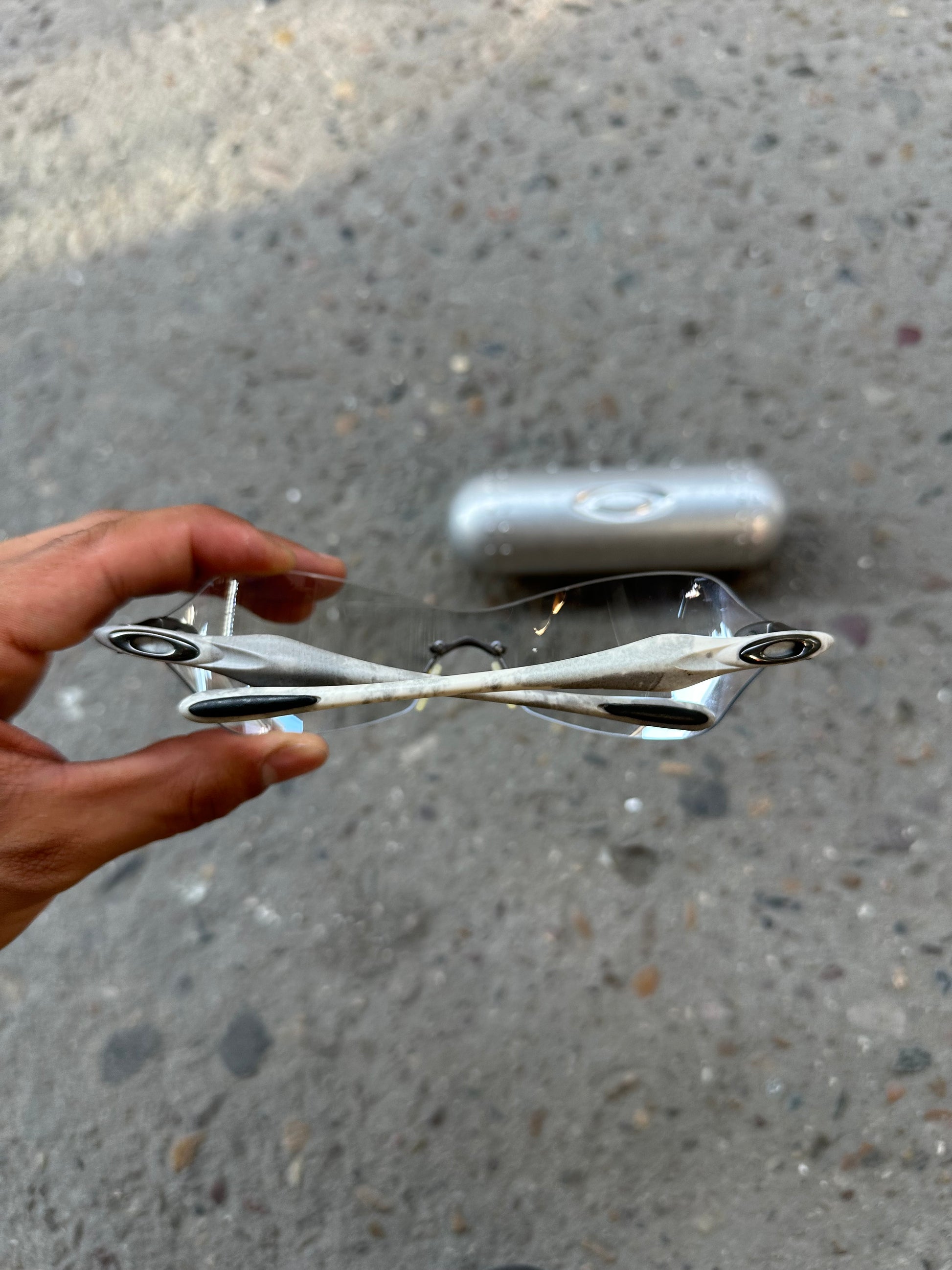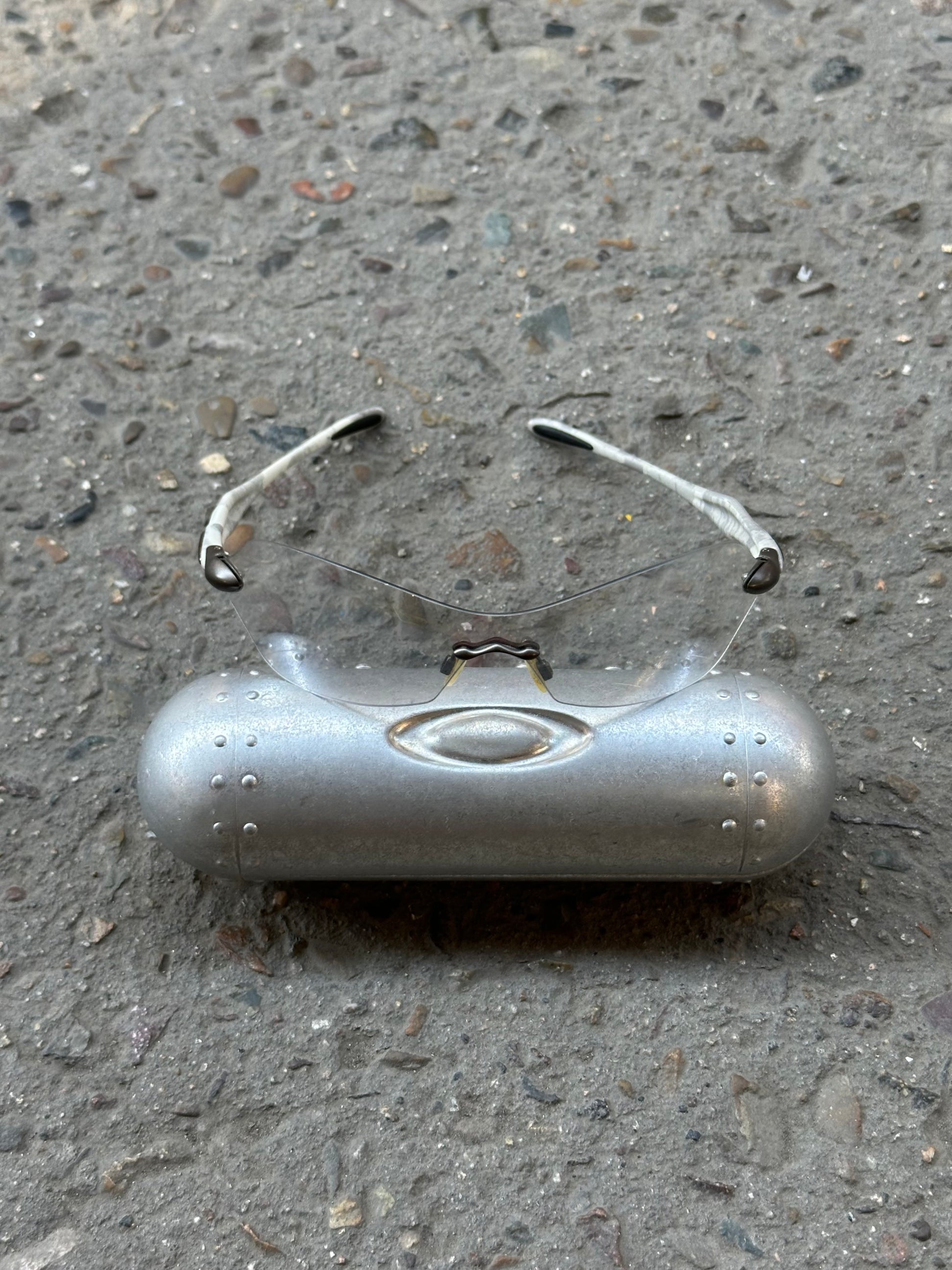 Early-2000s rimless design with translucent grey camo-style frame and lightweight wraparound fit. Collectible archive Oakley piece with futuristic Y2K energy. (Case not included).