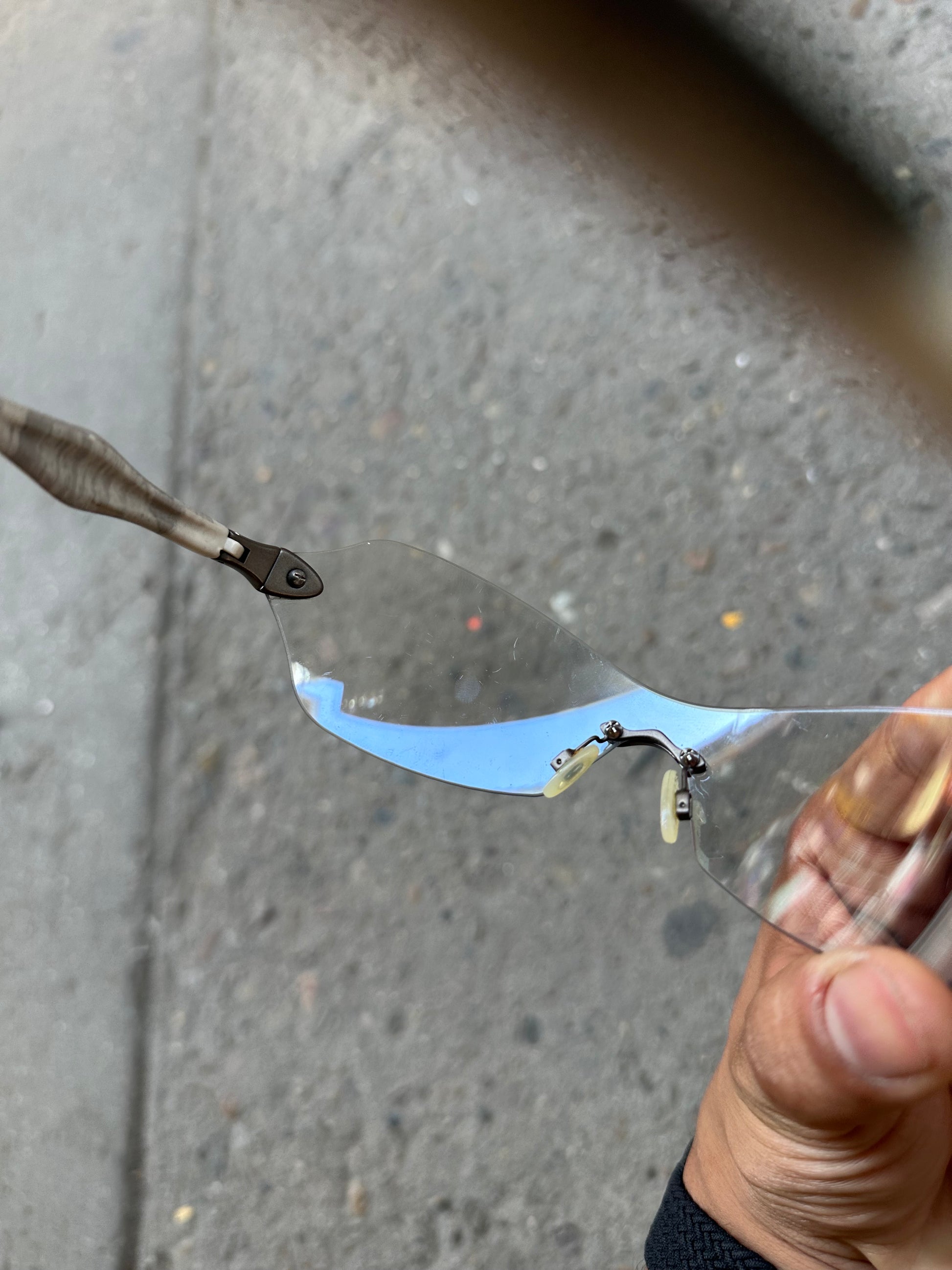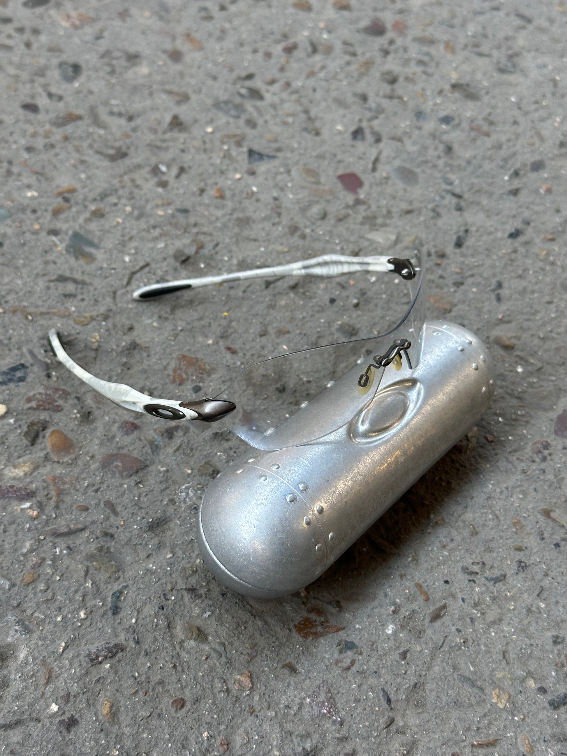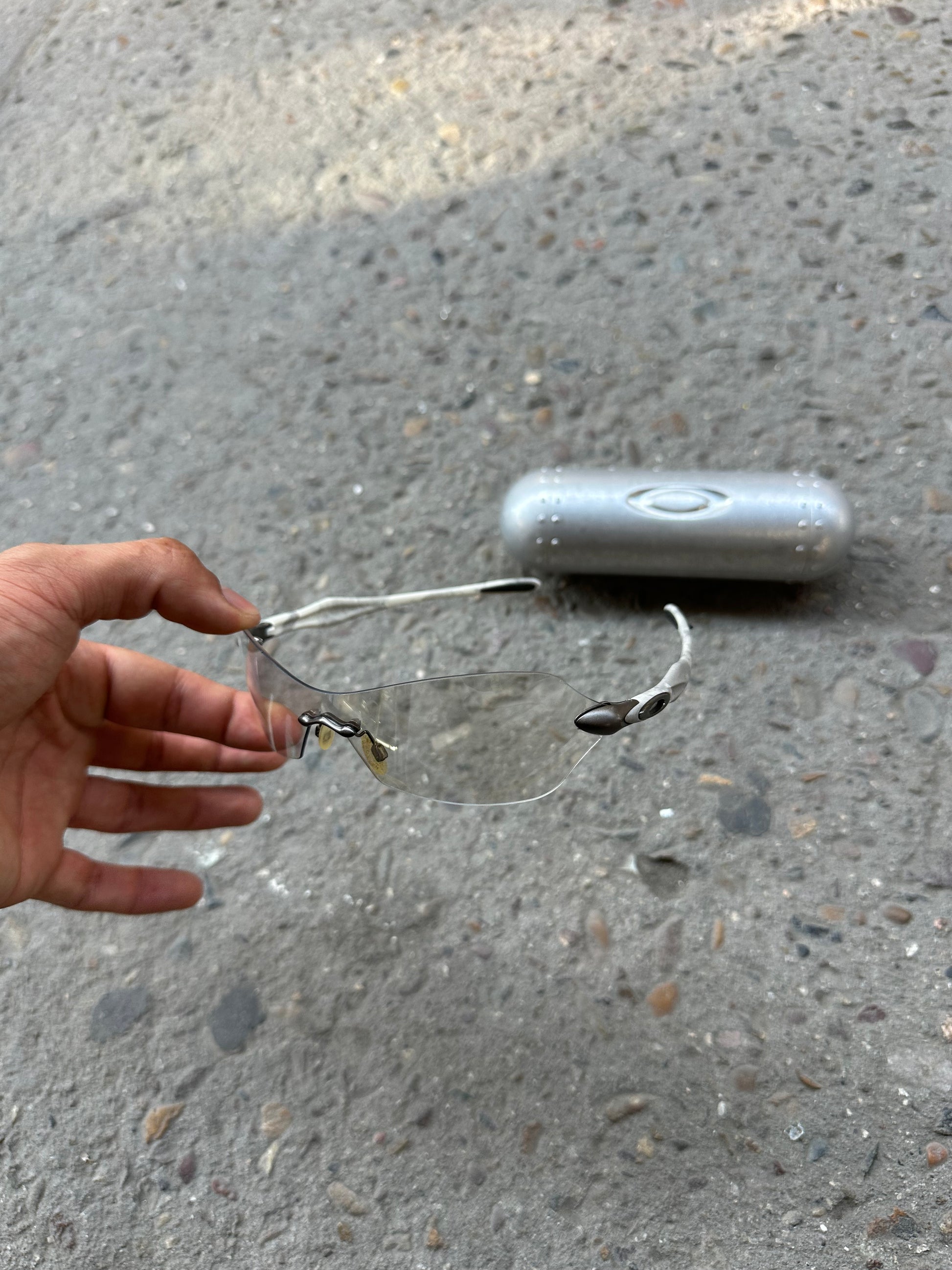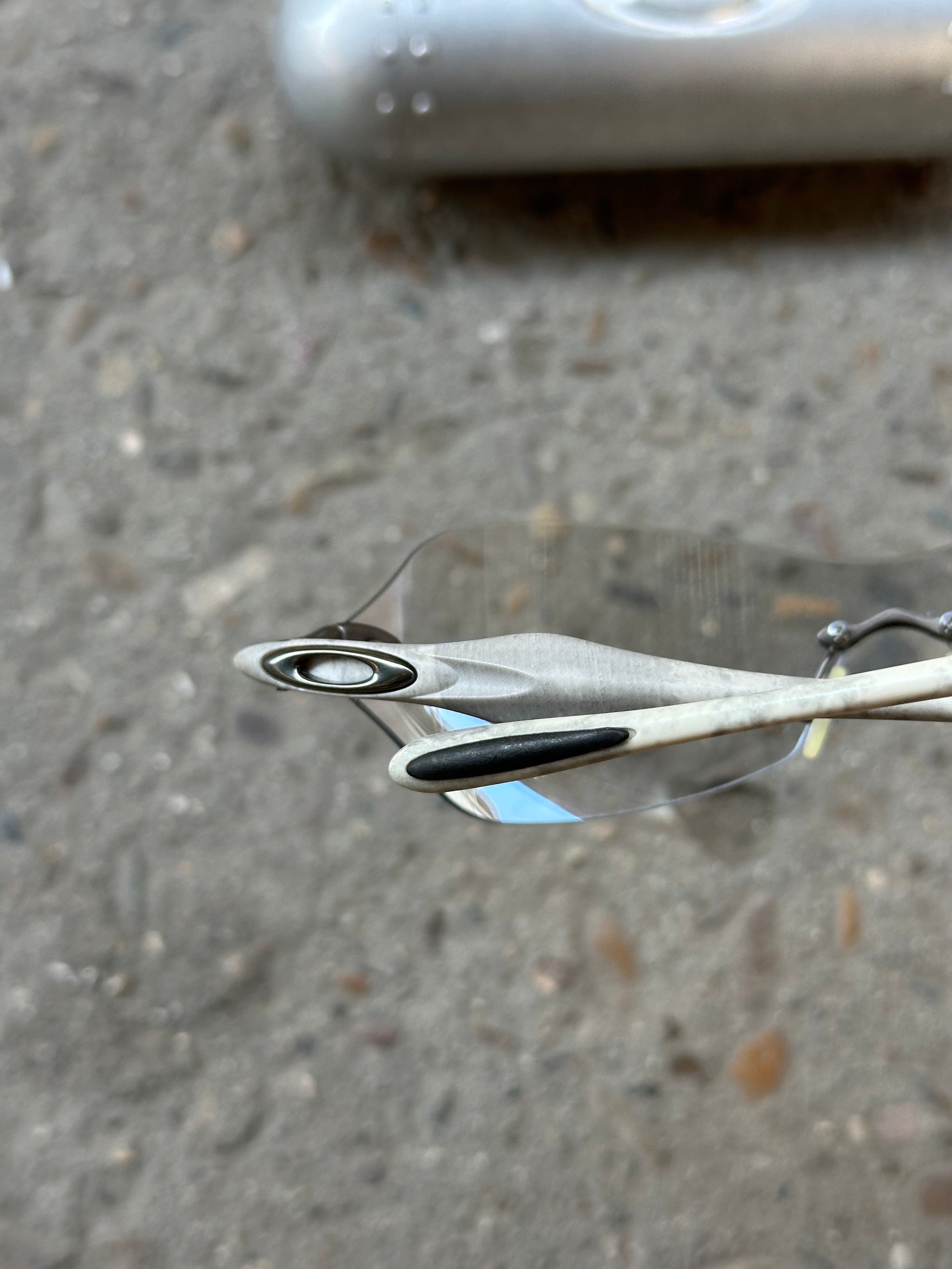 Early-2000s rimless design with translucent grey camo-style frame and lightweight wraparound fit. Collectible archive Oakley piece with futuristic Y2K energy. (Case not included).