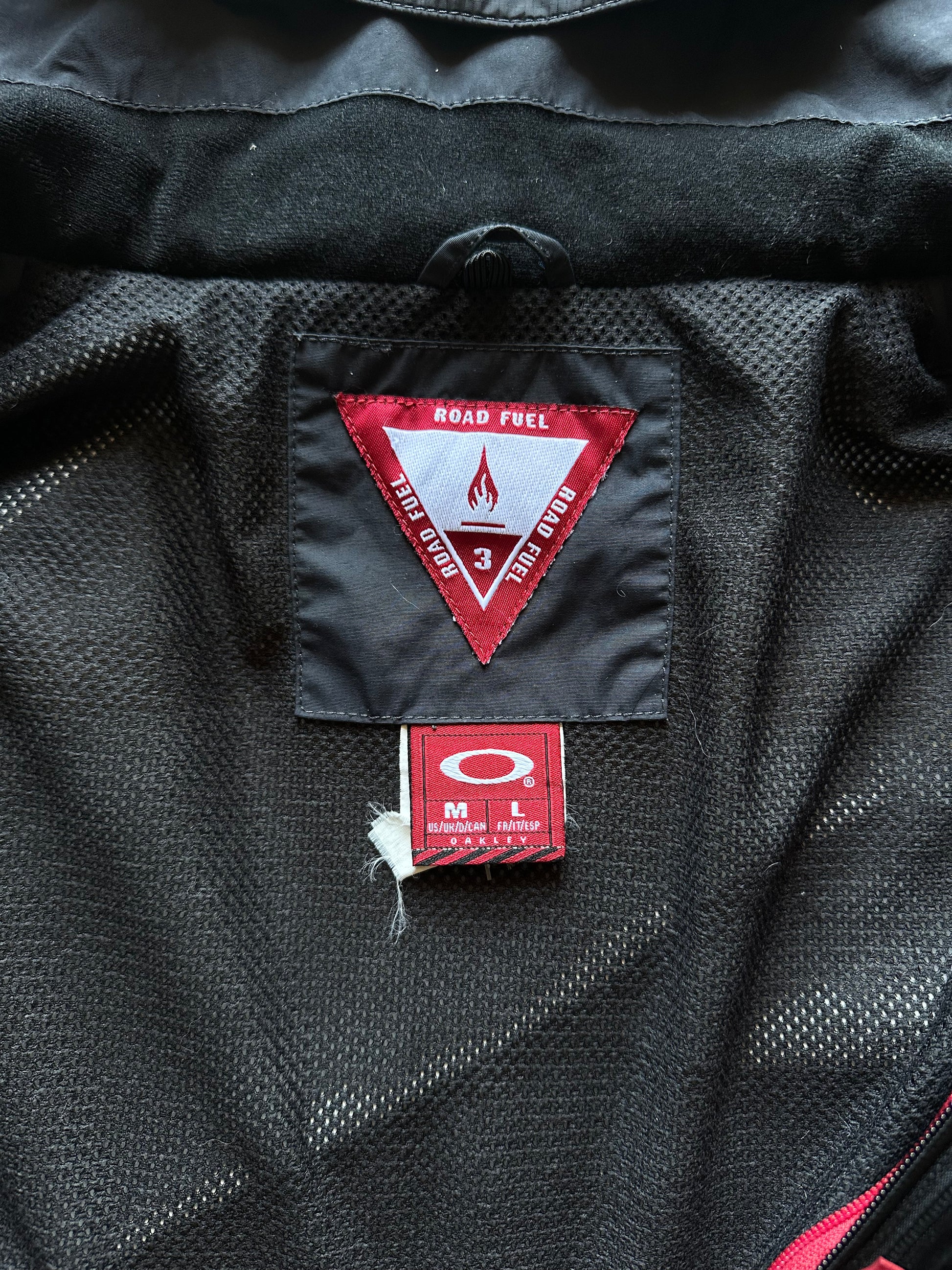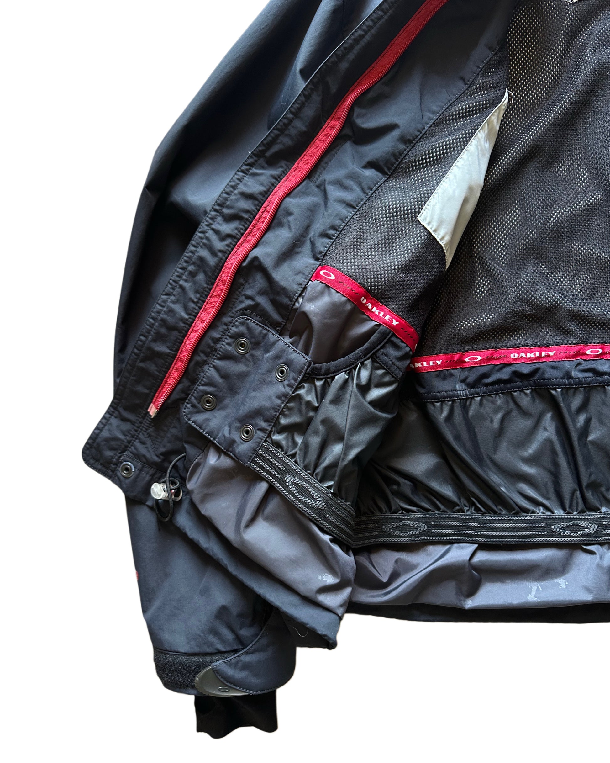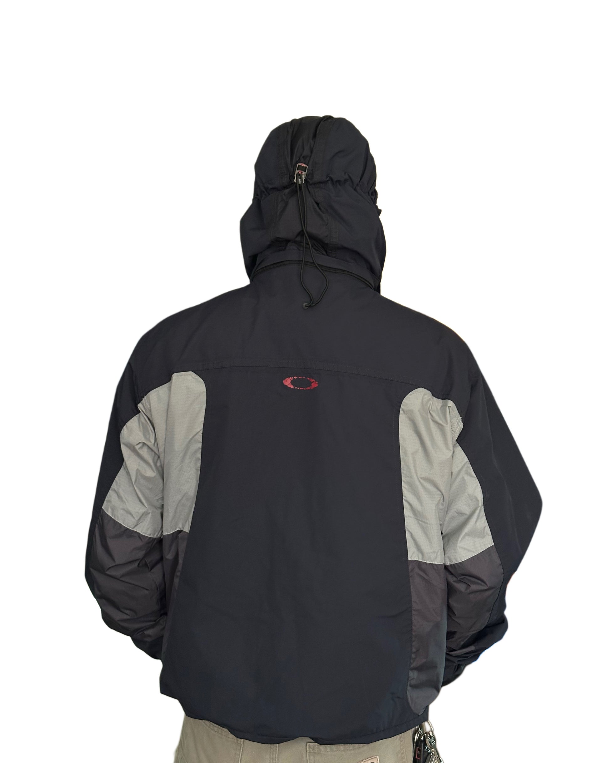 Technical Oakley outerwear loaded with 2000s design details — cross-chest and side pockets, underarm vents, adjustable waist and collar, and a removable hood. Functional and collectible.